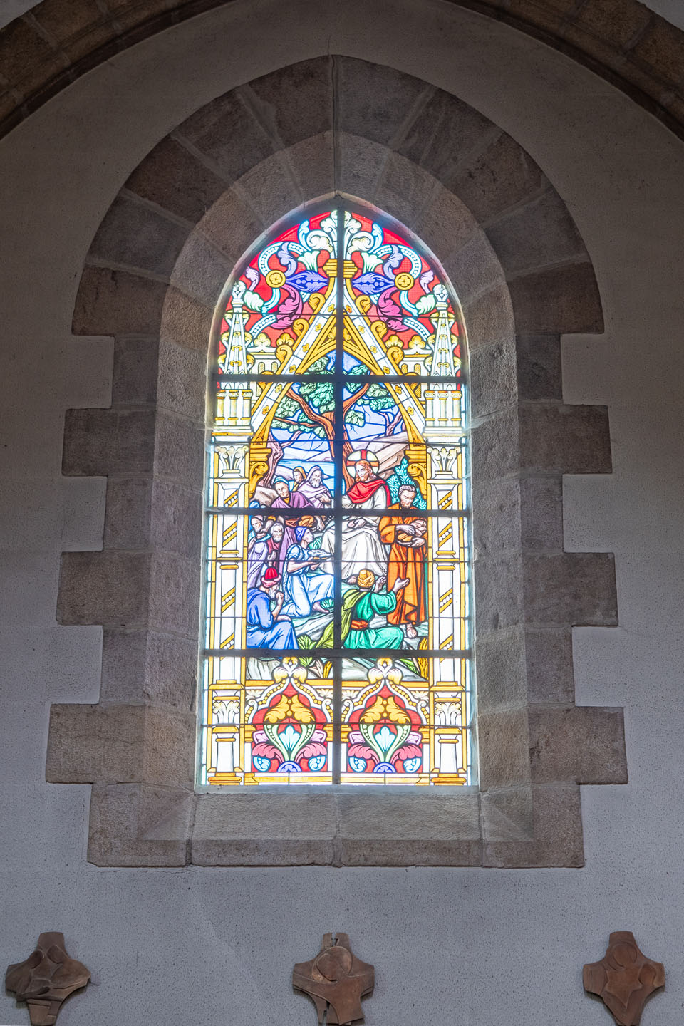 Pour s'intégrer parfaitement à l'édifice, ce vitrail présente les mêmes motifs végétaux et architecturaux pour les autres vitraux des bas collatéraux. Et pour bien ancrer ce vitrail dans notre commune de Broons, il dissimule une référence à une tranche d'histoire de la ville : réservé aux plus curieux d'entre vous !...