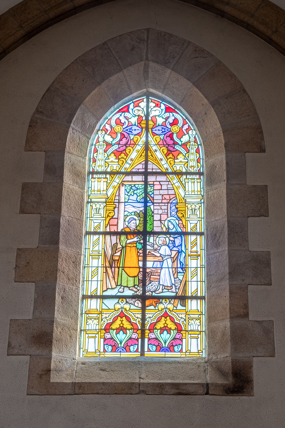 13 - La Sainte famille : Saint Joseph charpentier initie Jésus au rabot, Sainte Marie tient une quenouille. Nazareth.