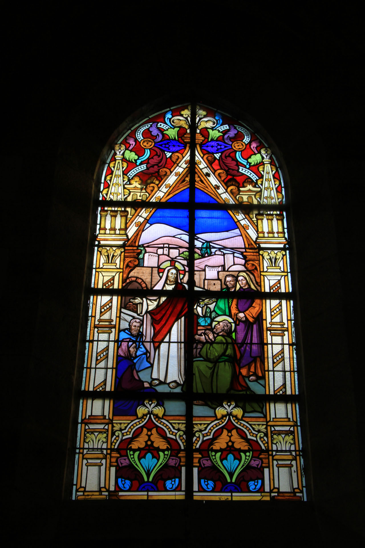"Du haut de la lancette centrale part une croix lumineuse qui se déploie dans la grande rosace supérieure. Marie Madeleine nous est donc représentée là au pied de la croix, - comme elle l'était réellement au Calvaire. Elle tient dans sa main le vase qui contenait le parfum répandu sur la tête de Jésus quelques temps avant sa mort."